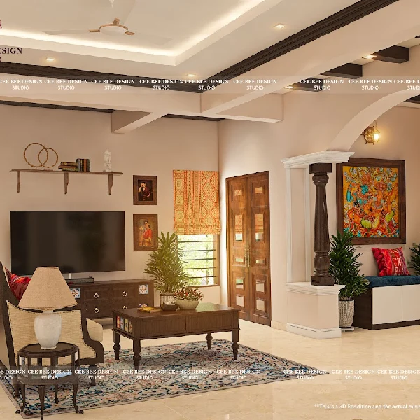 • Cultural Accents: Carved doors, temple bells, handcrafted pottery, and traditional artwork complete the look with soulful detail.