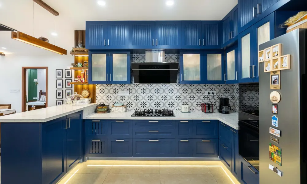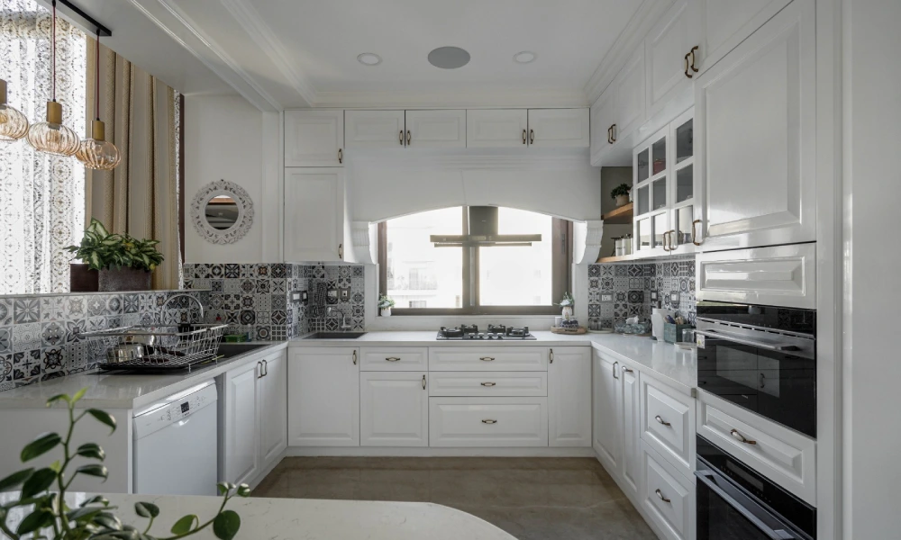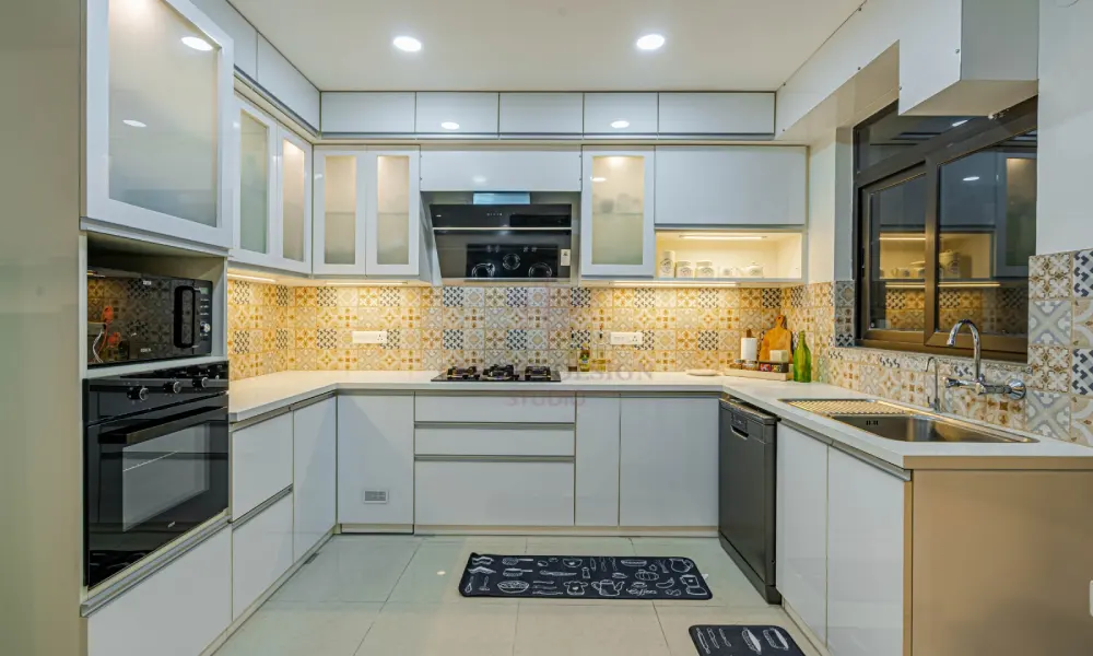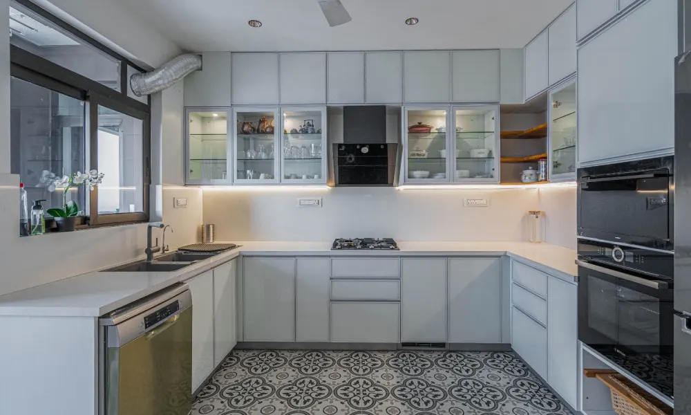 U-shaped designs are ideal for those who require quite a bit of storage space. The design is like an embrace, as the cupboards encircle you to keep all your items in proximity. This design is ideal because in Indian cuisine, various pans, vessels, and appliances are required. This design gives one the feeling of being in control because nothing is ever far away.
