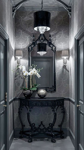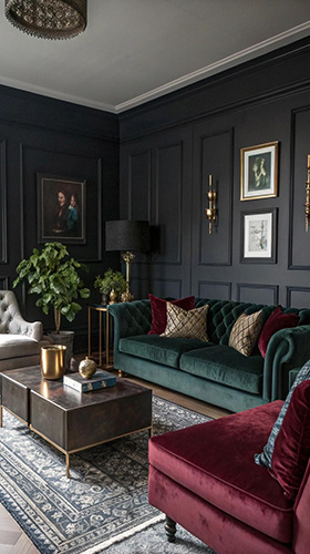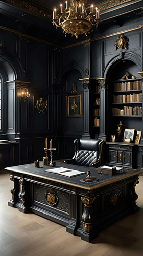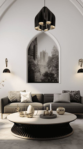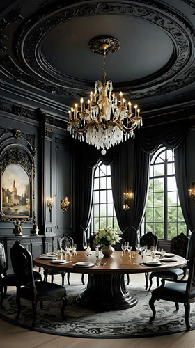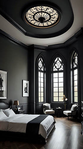 Gothic design is characterized by dark colours, rich embellishments, intricate moldings, and ornate detailing. It carries a dramatic essence and embraces an opulent, decorative style. A defining aspect of modern Gothic interiors is the interplay between light and shadow, which adds depth and theatricality to the space.