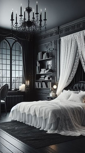 Four-poster or canopy beds paired with heavy drapes and moody, layered lighting create a rich, intimate atmosphere. Gothic-style furniture adds a timeless, romantic touch.