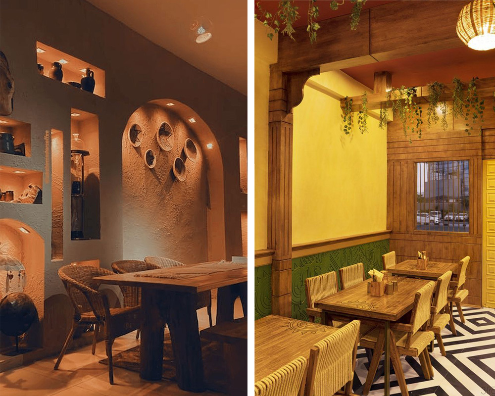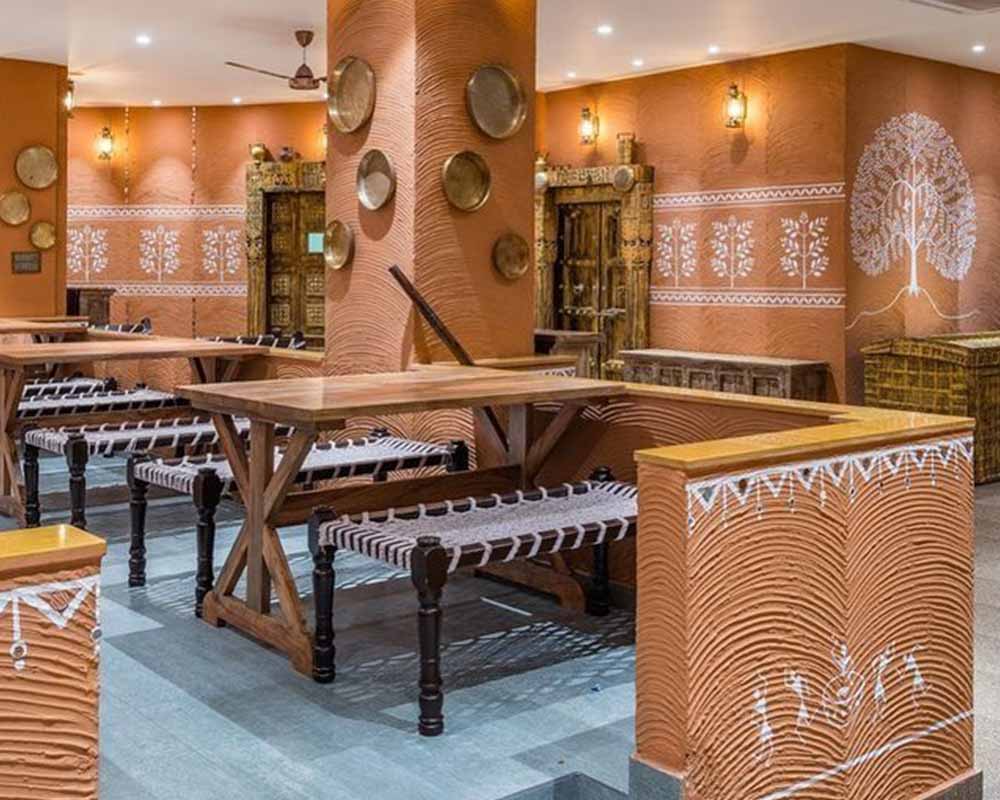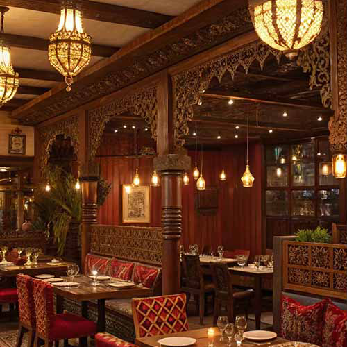 Indian restaurant interiors are deeply rooted in tradition, featuring intricate motifs, jaali panels, and the use of wood, brass, and ethnic art pieces. Together, these elements create a divine atmosphere and a culturally rich environment that celebrates heritage.