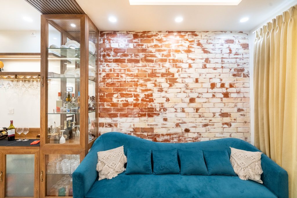 The deep teal curved sofa adds a rich, earthy contrast to the brick’s warm undertone while the wooden bar unit with illuminated niches on the side introduces both function and warmth. Together, they create a setting that feels inviting and grounded, not staged or synthetic.