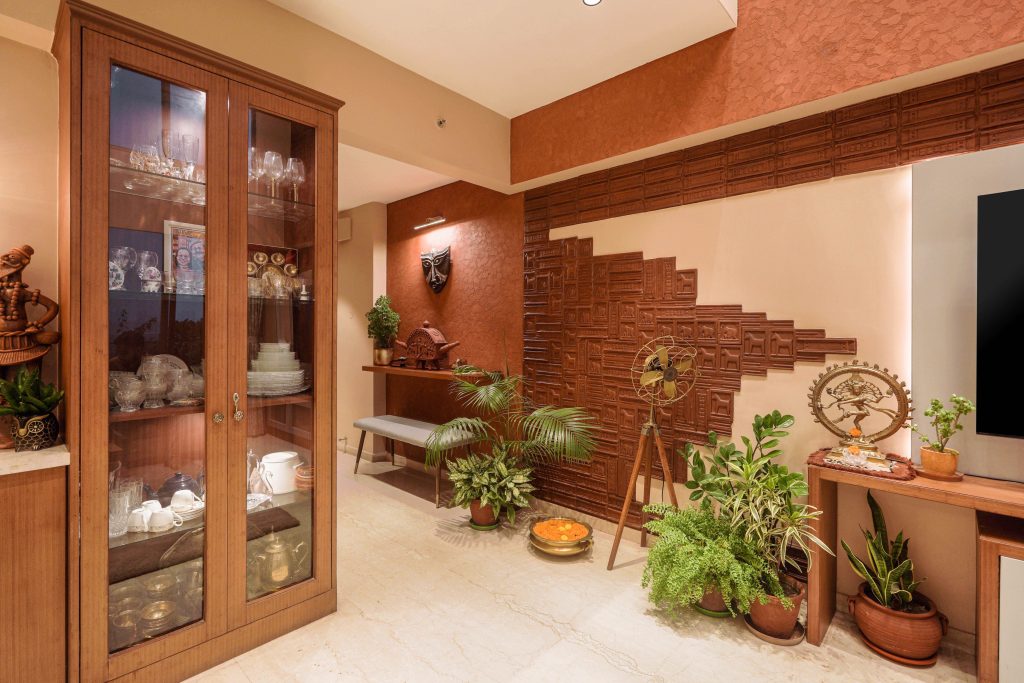 For a duplex apartment, we wanted to create an entryway that instantly communicated warmth and cultural depth. We used a richly textured, reddish-brown terracotta-inspired finish on the walls.We sourced the terracotta from local artisans in Bishnupur, Bengal. The highlight is a custom-designed wall panel featuring repetitive, handcrafted motifs reminiscent of temple architecture or ancient wood carvings. This piece acts as the primary rustic anchor. We used the existing marble flooring and paired it with abundant greenery and simple clay pots. A sleek, modern curio cabinet in solid wood provides both storage and a display for traditional artifacts, beautifully marrying the rustic feel of the earthen wall with the clean functionality of modern furniture. This entire corner shows how the raw, earthy textures (terracotta and clay) provide the authentic soul, while the lighting and the smooth cabinet keep the look polished and traditional.