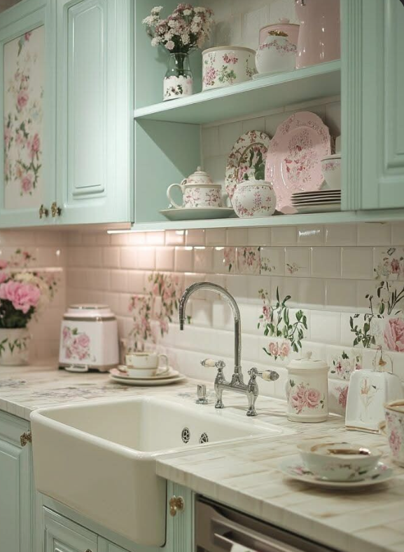 • Kitchens: Open shelving and vintage crockery bring functional beauty, echoing the comfort of a lived-in, lovingly used space.