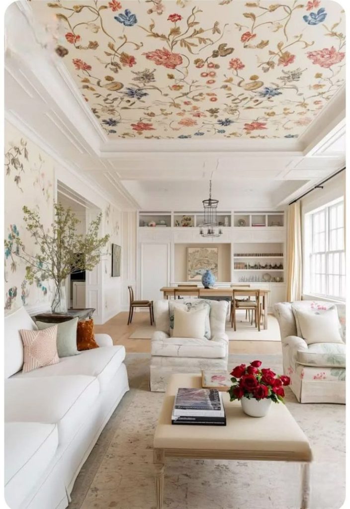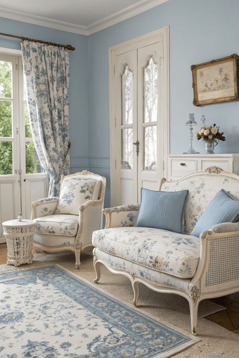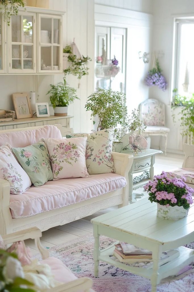 • Living Room: Whitewashed furniture and floral upholstery create a cozy, welcoming ambience with a hint of countryside romance.