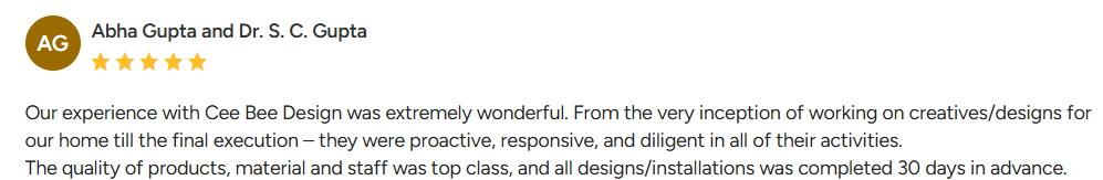CeeBeeDesignStudio is one of the fastest growing interior execution companies. Currently we have very strong presence in Bangalore, Goa, and Kolkata. Our motto is to keep the clients requirement and budget in mind and give a qualitative result on time.