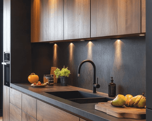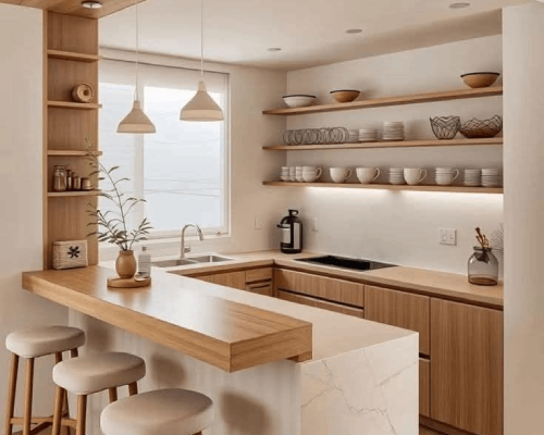 • The design works especially well when wood is combined with stone, quartz, or matte finishes, offering durability along with a refined aesthetic.