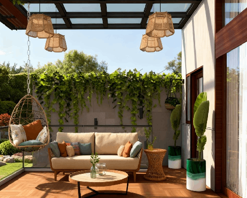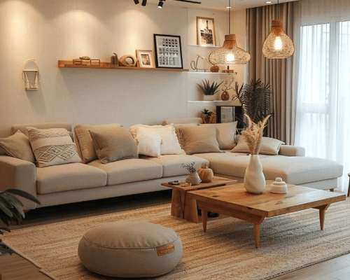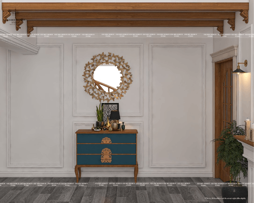 • Wooden furniture further enhances the overall look, solid wood sofas, center/coffee tables, and side units bring depth and richness to the design.
