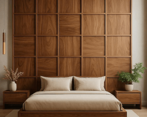 • Incorporating wooden wall paneling elevates the design with an executive or premium look, making the room feel more refined.