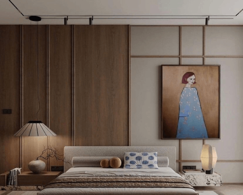 • Wooden bed frames, wardrobes, dressers, and side tables bring a cohesive design language, tying the room together seamlessly. Incorporating wooden ceiling details or subtle trims can also elevate the ambiance.