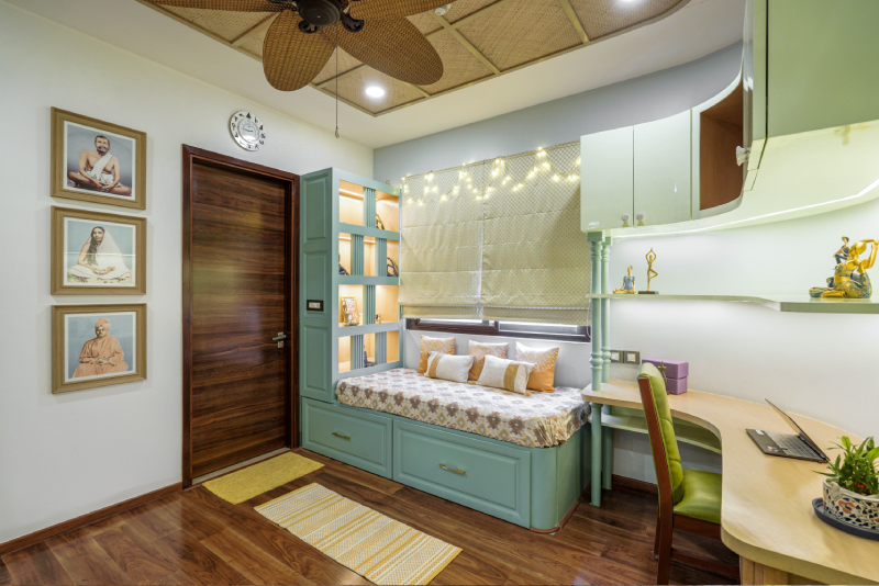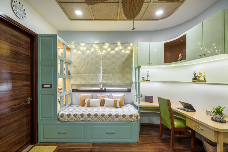 The first step is keeping the bedroom clutter-free. Too many visible items can make the space feel restless, even if the colors are calm. Hidden storage works beautifully here—beds with drawers, wardrobes with clean shutters, or concealed cabinets—so everyday items stay out of sight and the room feels open and uncluttered.